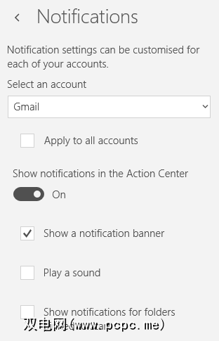 进行设置您的偏好设置,请导航至设置(齿轮图标)>通知。在菜单顶部,选择要将新设置应用于哪个帐户,然后选择是否要在“操作中心"中接收通知,是否在收到新邮件时播放声音以及是否要会显示一个通知横幅。