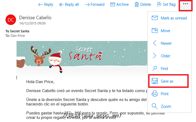 要保存消息,请在阅读窗格中打开有问题的电子邮件。接下来,点击右上角的三个平行点,然后选择另存为。选择您的首选目的地,然后点击保存。