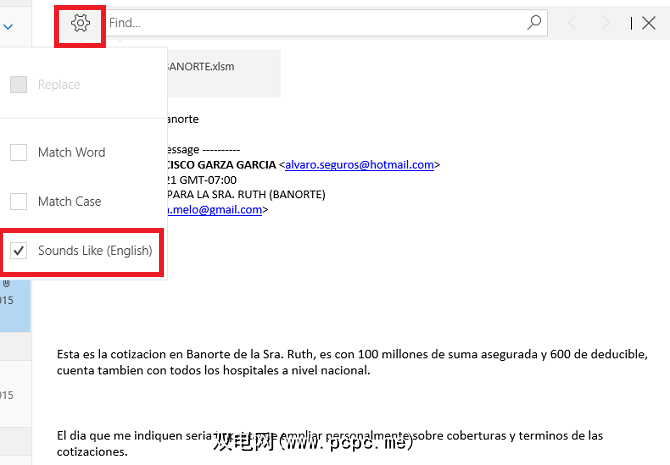 收件人要查看实际效果,您需要使用外语写成的电子邮件。确保已将其显示在阅读窗格中,然后单击三个点>查找。