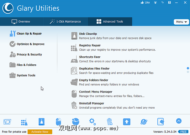 Glary Utilities 5包含许多有用的维护工具:磁盘清理,快捷方式修复程序,上下文-菜单管理,碎片整理等。但是,它还包含一些“蛇油"应用程序,例如注册表清理器。总体来说,这是一个有用的工具。