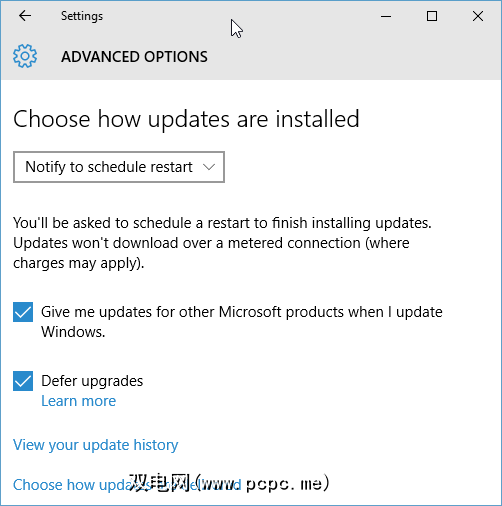 如果该选项可用,则更新最多可以延迟八个月;否则,不进行任何更新。在那之后,Windows 10将负责,迫使您安装到期更新。 Windows 10采用一种有点狡猾,有点恼人的强制方法,会减慢其安全更新,要求您完全更新系统以保持完全受保护。我说有点狡猾;