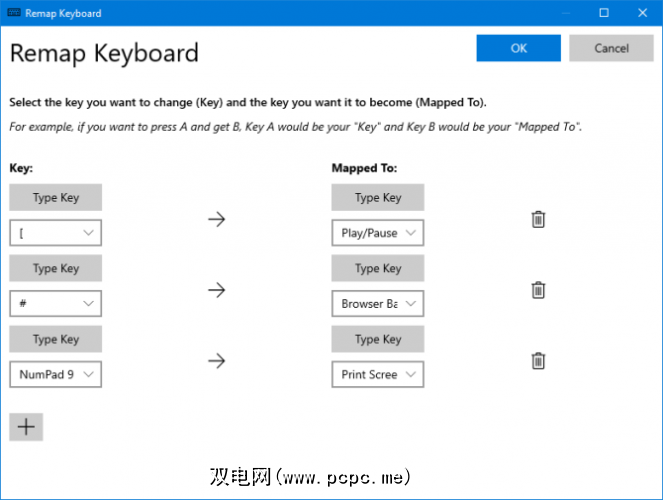 点击重新映射键或重新映射快捷方式。点击加号图标以添加重新映射。左侧是现有键或快捷方式,而右侧是您要将其重新映射到的键或快捷方式。使用垃圾桶图标删除所有重新映射。完成后,单击确定。