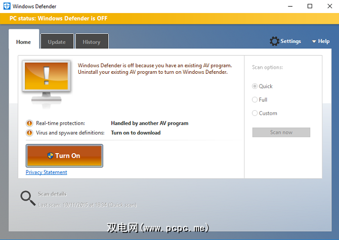 不再。 Windows Defender现在是Windows 10的关键部分,如果意识到计算机上未运行任何AV软件,它将自动启用自身。