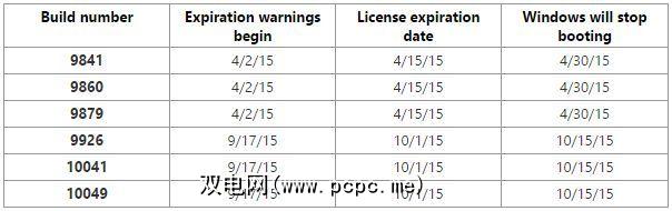 技术预览版(现称为Insider Previews)最终将到期。 Microsoft支持工程师概述了版本号最多为10049的有效期。两周前,系统将提醒用户并要求其升级到较新的版本。许可证过期后,系统将每三个小时自动重启一次。对于Build 10049,该日期是2015年10月15日。在该日期之后大约两周,该构建甚至不会启动。