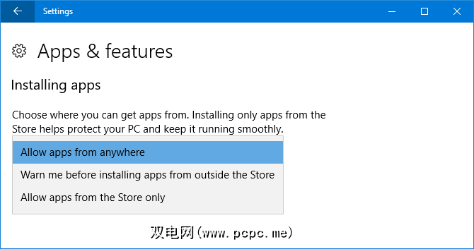 要调整此设置,请转到应用程序>应用和功能,然后使用安装应用下拉菜单。 允许在任何地方使用应用是默认设置,但您也可以切换到在从商店外部安装应用之前警告我和仅从商店允许应用 >。
