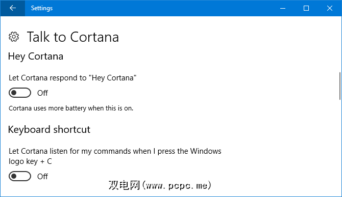 所有 Cortana 设置现已在“设置"中分组在一起。 Cortana>与Cortana对话,您可以通过语音,键盘快捷键或锁定屏幕来设置如何激活Cortana。