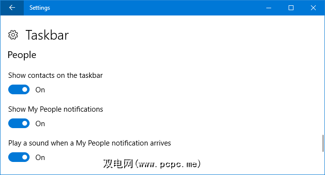 要编辑其行为,请转到个性化>任务栏,然后滚动到人部分。您可以通过在任务栏上显示联系人完全将其关闭,或使用显示我的人的通知和在“我的人"通知到达时播放声音。