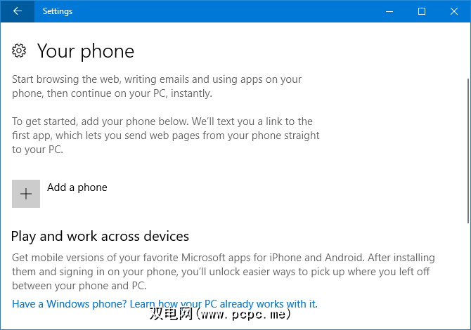 新的电话部分,您可以将iPhone或Android手机链接到Windows 10 PC。点击添加电话开始使用并遵循向导。您需要验证您的电话号码并下载它发送给您的应用。