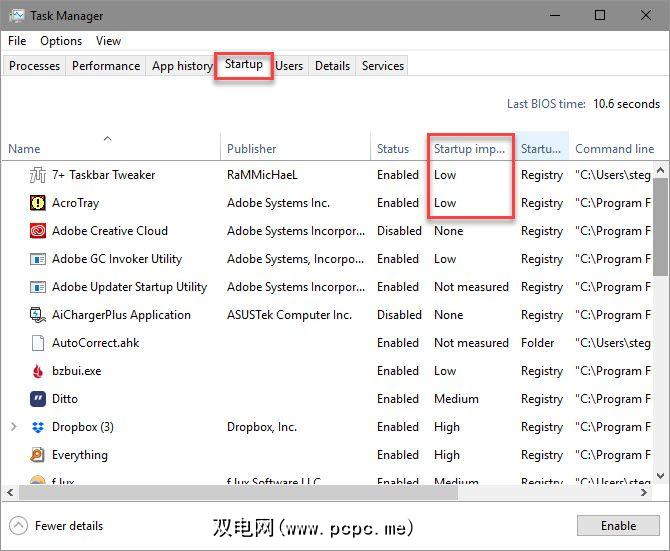 在这里,您会看到所有设置为在启动时运行的程序。您可以使用标题按名称,状态或启动影响进行排序。要阻止某个程序运行,只需选择它并单击底部的 Disable 按钮即可。