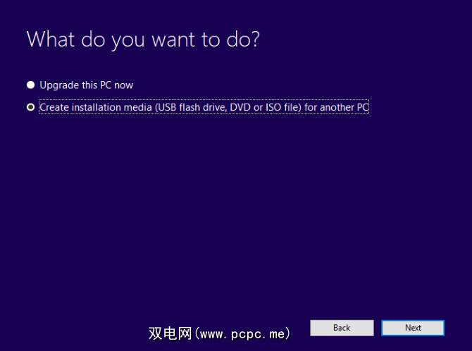 您将看到两个选项。选择为另一台PC创建安装介质(USB闪存驱动器,DVD或ISO文件),然后单击下一步。