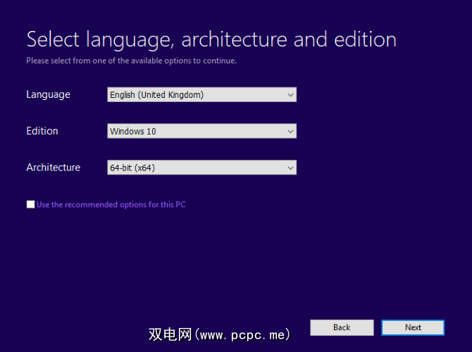 设置首选的语言,Windows 10 版本和系统体系结构。请注意,如果无法更改这些设置,则应清除标有在此PC上使用推荐的选项的复选框。再次点击 Next 。