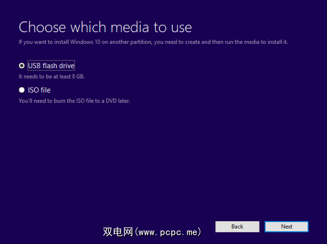 选择 USB闪存驱动器,然后选择 Next ,然后从列表中选择USB驱动器。再次单击下一步,提示下载Windows 10安装文件。