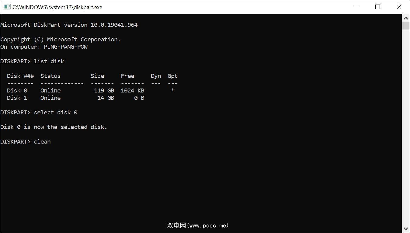 - 在继续之前,您必须完全擦除硬盘驱动器。为此,请键入clean并按 Enter。
