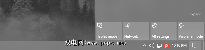 如果愿意,还可以使用Windows 10的平板电脑模式使应用始终以全屏模式打开,并启用“开始"屏幕。要打开它,请按 Win + A 打开操作中心,然后选择 Tablet模式磁贴以启用它。如果您使用的设备没有触摸输入,则可能无法正常工作。
