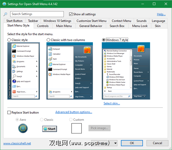 在Open Shell的开始菜单样式选项卡上,选择 Windows 7样式选项。在此下方,点击显示的选择皮肤文本。在皮肤框中,选择 Windows Aero 。
