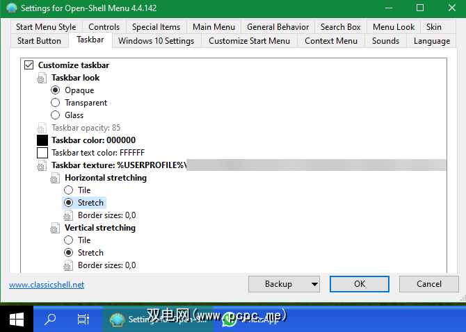 此后,单击水平拉伸 >选项激活皮肤。当为 Horizontal 和 Vertical Stretching 选项选择 Stretch 时,我们获得了最佳效果。完成后,单击确定,然后Open Shell将使用该模板以熟悉的蓝色调为任务栏重新设置外观。