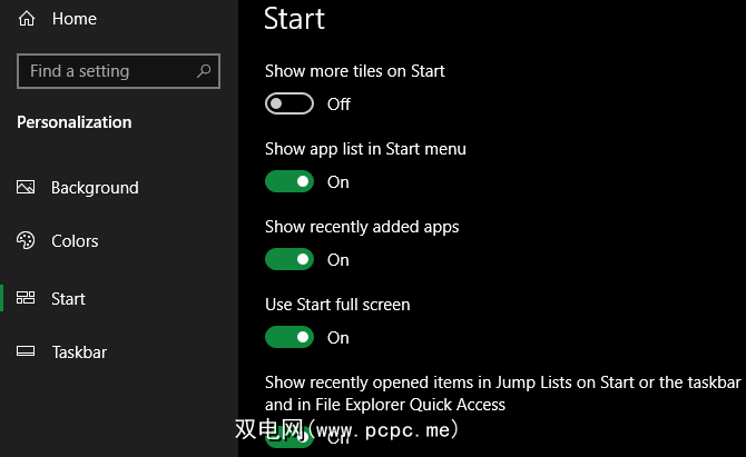 选择左侧栏中的开始 。在这里,启用使用开始全屏显示选项。