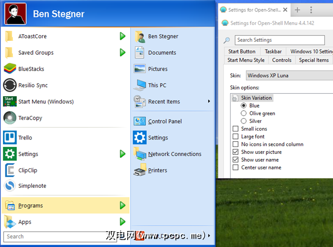 这将为您的“开始"菜单提供熟悉的外观。在皮肤选项框中,您可以更改一些其他选项,例如更改颜色,显示用户图片和名称以及是否在右栏中显示图标。
