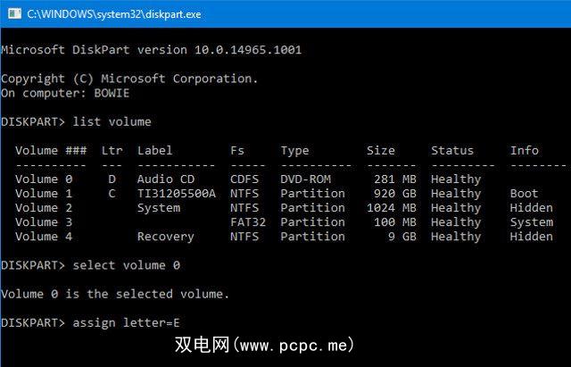在这里,您可以使用选择和分配字母命令可将正确的字母重新分配给未分配的卷。例如,如果我想将字母E分配给上图中的音频CD音量,我将首先输入“ select volume 0",然后输入“ assign letter = E"来完成该过程。