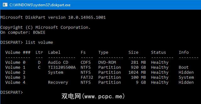 diskpart完成此操作后,输入列表卷以打印当前已连接到系统的所有卷的详细信息。