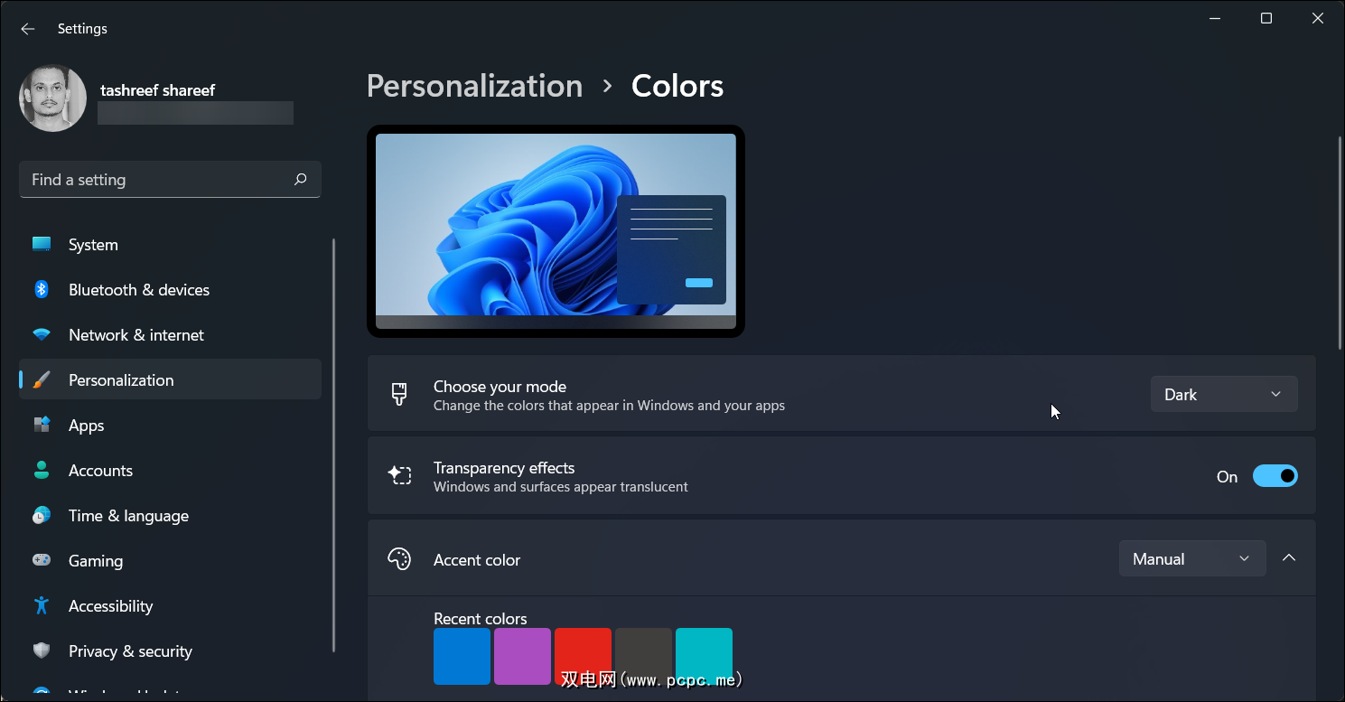 要在 Windows 11 中启用深色模式,请转到设置 > 系统 > 个性化 > 颜色。然后,单击“选择您的模式”下拉菜单并选择“暗”。