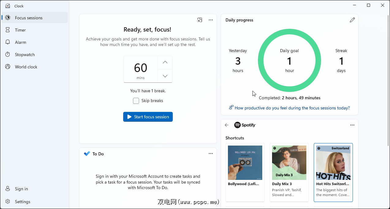 Windows 11 的新时钟应用程序具有 Focus Sessions 选项卡。此工具是一个方便的以生产力为中心的功能,可帮助您养成健康的数字习惯、设定每日目标并挑战自我。当您打开“专注会话”选项卡时,您将看到专注计时器、每日进度报告以及同步 Spotify 播放列表和微软待办帐户的选项。