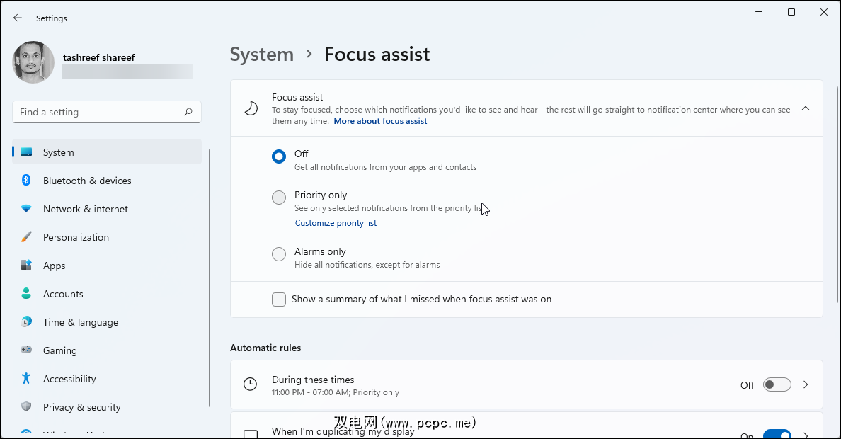 要启用对焦辅助,请转至设置 > 系统 > 对焦辅助。接下来,选择Priority only以查看一些选定的通知或Alarms only以隐藏除警报之外的所有通知。