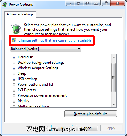 有关其他几个选项,请单击>更改左下方的高级电源设置链接。在打开的新窗口中,还单击>更改当前不可用的设置以访问所有高级设置。