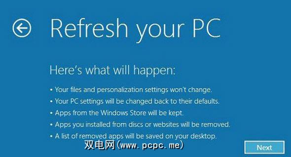 新功能称为 Refresh ,它可以部分重新安装。本质上,刷新将保存您的计算机模块的映像,重新安装Windows内核,然后重新插入系统的其他组件。这意味着您不会丢失任何应用程序或用户数据,只需重新启动操作系统即可。
