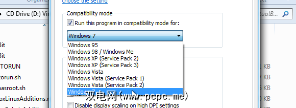 这样做有麻烦吗?安装VirtualBox Guest附加项可以提供帮助。单击VirtualBox中的“ 设备",然后单击“ 安装来宾添加项"。 Windows 8会提示您自动安装这些添加项,但不会。转到Windows桌面应用程序,然后打开Windows资源管理器。转到CD驱动器,您会发现其他内容。右键单击安装文件,然后将其设置为以Windows 7模式运行: