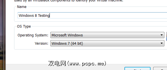 设置好VirtualBox之后,您将需要创建一个新的虚拟机来安装Windows8。在询问您所使用的操作系统时设置中,选择“ Windows 7 "(如果您下载的是Windows 8的64位版本,请选择“ 64位")。