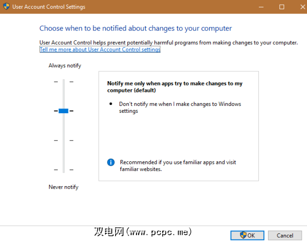 请确保您也未禁用UAC。这样做将阻止标准帐户甚至看不到UAC提示,因此尝试执行管理操作将失败,且不会发出通知。在“开始"菜单中输入 UAC ,然后点击更改用户帐户控制设置。确保滑块未设置为从不通知的底部选项。顶部的第二个选项是默认选项,应该可以正常工作。
