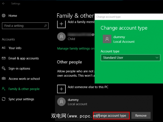 如果要将标准帐户提升为管理员帐户,请先登录另一个管理员帐户并打开设置。访问帐户,然后点击家庭和其他人标签。在其他人下选择您的帐户,然后点击更改帐户类型按钮。将其从标准用户更改为管理员,您将拥有全部权限。