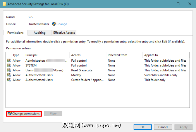 在此窗口中,切换到安全性选项卡。接下来,点击底部附近的高级按钮。您将在PC上看到每个用户组的权限的完整列表。如果您进行了更改,这将有所不同,但是以下是正常权限列表的外观的想法: