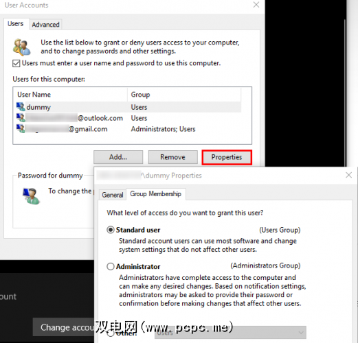通过用户帐户执行此操作的另一种方法页面。在开始菜单中键入 netplwiz 进行访问。在这里,您会看到计算机上每个用户的列表。点击一个,然后点击属性按钮,然后选择组成员身份标签。您可以将帐户从标准更改为管理员。 其他选项包含很多其他类型的帐户,这些类型在业务用途之外并不常见。
