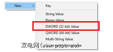 右键单击右侧面板中的任意位置,然后从上下文菜单中选择 New 。在下一个菜单上,单击 DWORD(32位)值。