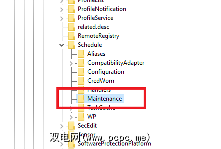 在注册表的左侧面板中,导航到 HKEY_LOCAL_MACHINE>软件> Microsoft> Windows NT> CurrentVersion>计划>维护。