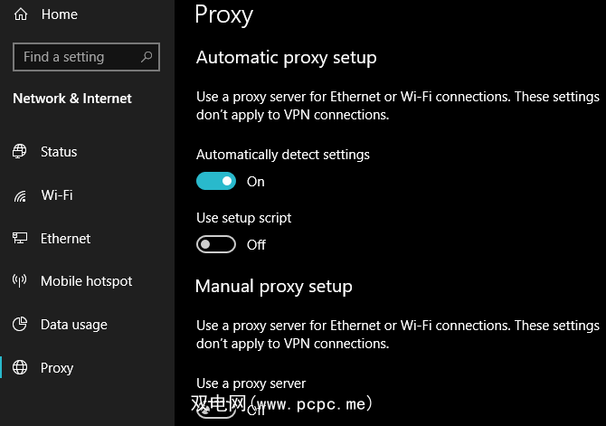 由于此问题与Windows代理服务器设置有关,因此,这是一个明智的检查方法。要访问Windows 10中的代理设置,请打开设置,选择网络和互联网类别,然后从左侧栏中切换到代理标签。