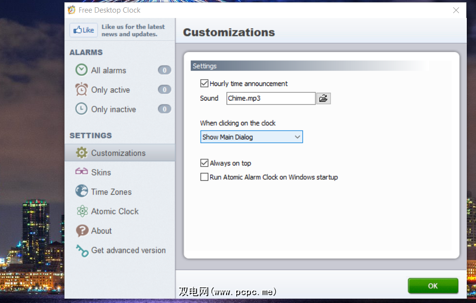 您可能会注意到免费桌面时钟窗口上的闹钟选项卡。这些附加功能仅在更高级的Atomic Alarm Clock 软件中可用,目前零售价为 14.95 美元。该软件使您能够为特定时间设置闹钟,并包含更多系统托盘时钟皮肤可供选择。在付费版本中,您还可以选择将时钟与互联网时间服务器同步。