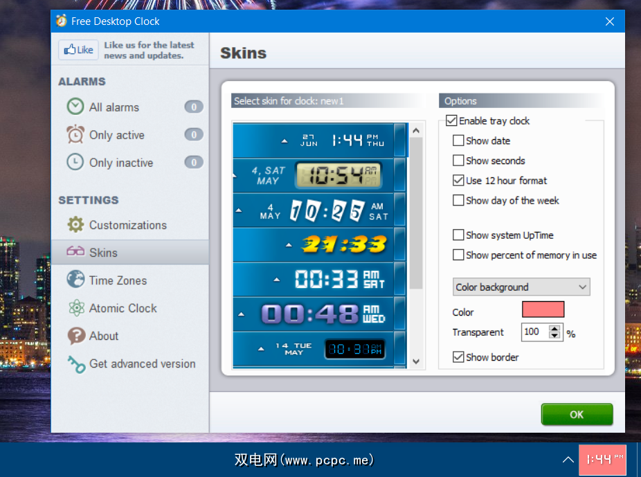 设置好所有内容后,打开“免费桌面时钟”窗口。单击窗口左侧的皮肤。如果尚未选中该选项,请选择启用托盘时钟。然后选择该选项卡上的皮肤之一,然后单击确定将其添加到系统托盘时钟,如下面的屏幕截图所示。