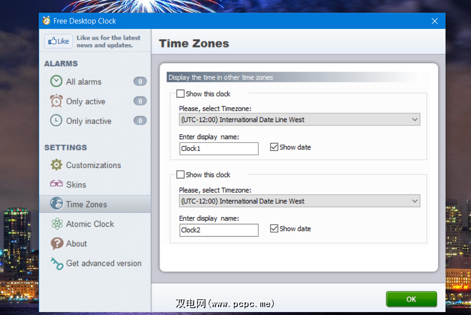 免费桌面时钟包括显示不同时区时钟的选项。如果您需要在拨打国际电话之前查看另一个国家/地区的时间,此类时钟会很方便。单击时区选项卡以查看这些选项。