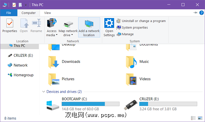 打开文件资源管理器(键盘快捷键 Windows键+ E )并导航到此PC 。在顶部菜单中,在“文件"旁边,单击“ 计算机"以打开功能区菜单,然后单击“ 添加网络位置"。