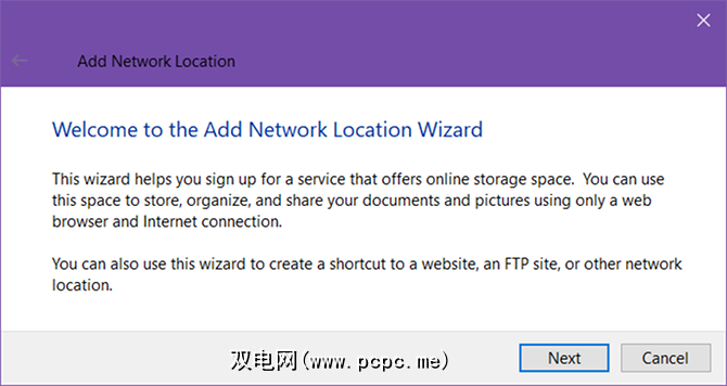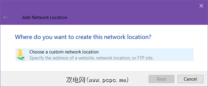在欢迎屏幕上在向导中,点击下一步。当提示您在何处创建网络位置时,选择选择自定义网络位置,然后单击下一步。