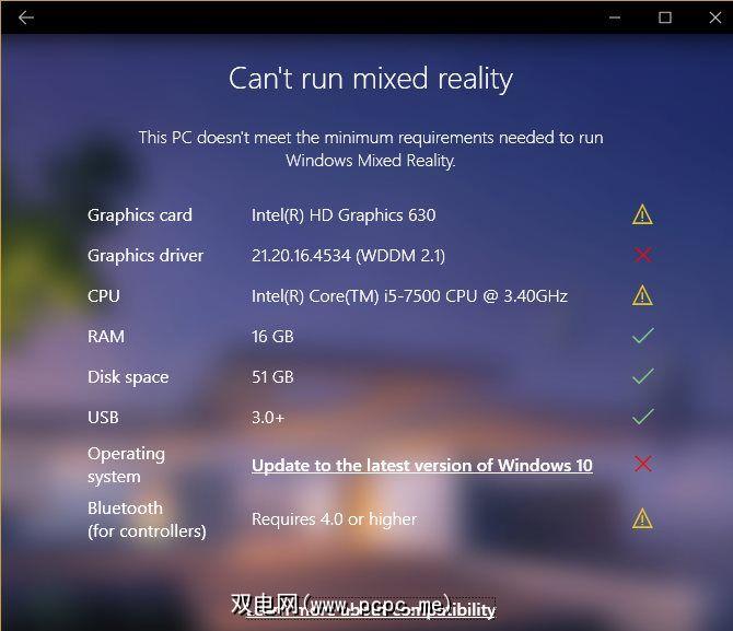 在这里,您会看到阻止您PC的原因。运行混合现实(如果有)。红色的 X 表示该组件将完全不起作用,而警告感叹号表示该设备尚未被确认可以正常工作。点击详细了解兼容性以获取更多信息。请注意,混合现实需要Fall Creator的更新,因此如果您在操作系统旁边看到 X ,请不要担心。该更新即将推出。