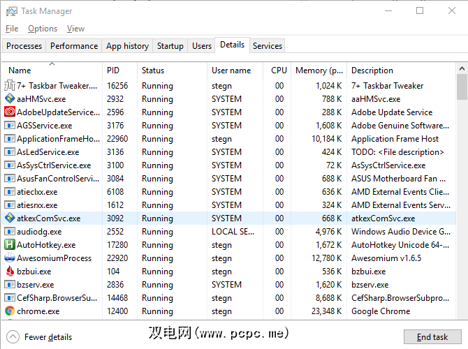 与管理员不同,您不能更改SYSTEM的用户属性。使用 Ctrl + Shift + Esc 快捷方式打开任务管理器,然后查看 Details 标签。您会注意到,您使用的应用(例如Chrome和Office)的帐户位于用户名标头下。但是系统进程(例如 wininit.exe )在SYSTEM下运行。