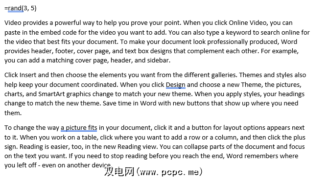 =rand(5, 10)第一个数字控制Word将创建多少个段落,第二个数字是每个段落的行数。