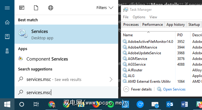 您需要打开服务面板以查看和调整Windows服务。最简单的方法是在“开始"菜单的搜索栏中输入 services.msc 。