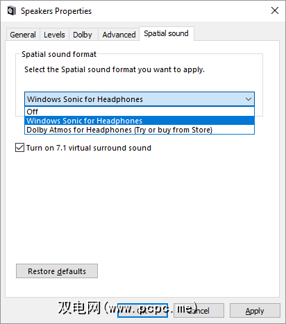 一旦您停用了任何音效,就可以激活并享受Windows Sonic 7.1模拟环绕声的全部功能。