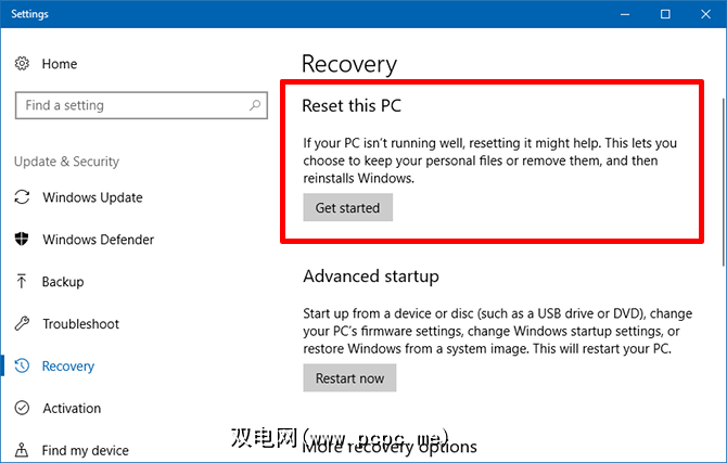 前往 Settings> Update和安全>恢复,然后在重置此PC 下,选择入门。按下按钮后,系统将立即重新启动,因此请确保事先备份所有重要文件。系统将重新启动,然后您可以选择保留我的文件或删除所有内容。