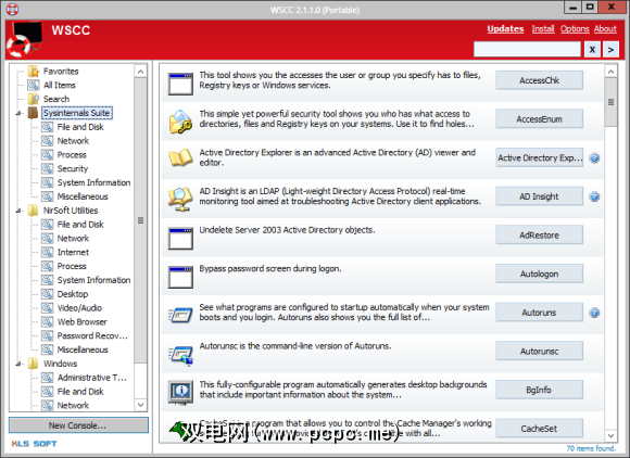 Windows System Control Center可以在2000年以后的任何Windows版本上运行,并且可以作为完全可移植的应用程序。它使您可以安装,更新和完全管理主要系统实用程序套件中的应用程序。最新版本侧重于Windows Sysinternals Suite和NirSoft Utilities提供的软件。